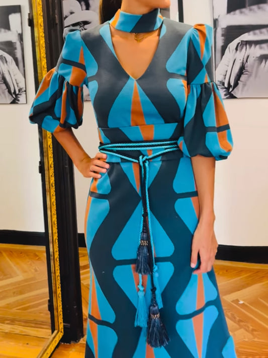 Sold outPrinted V Neck Balloon Sleeves Dress