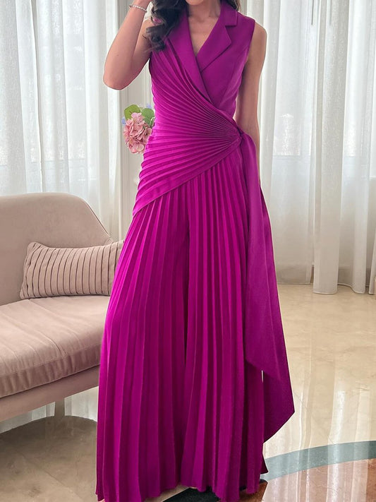 Fashion Lapel Pleated Sleeveless Wide Leg Jumpsuit